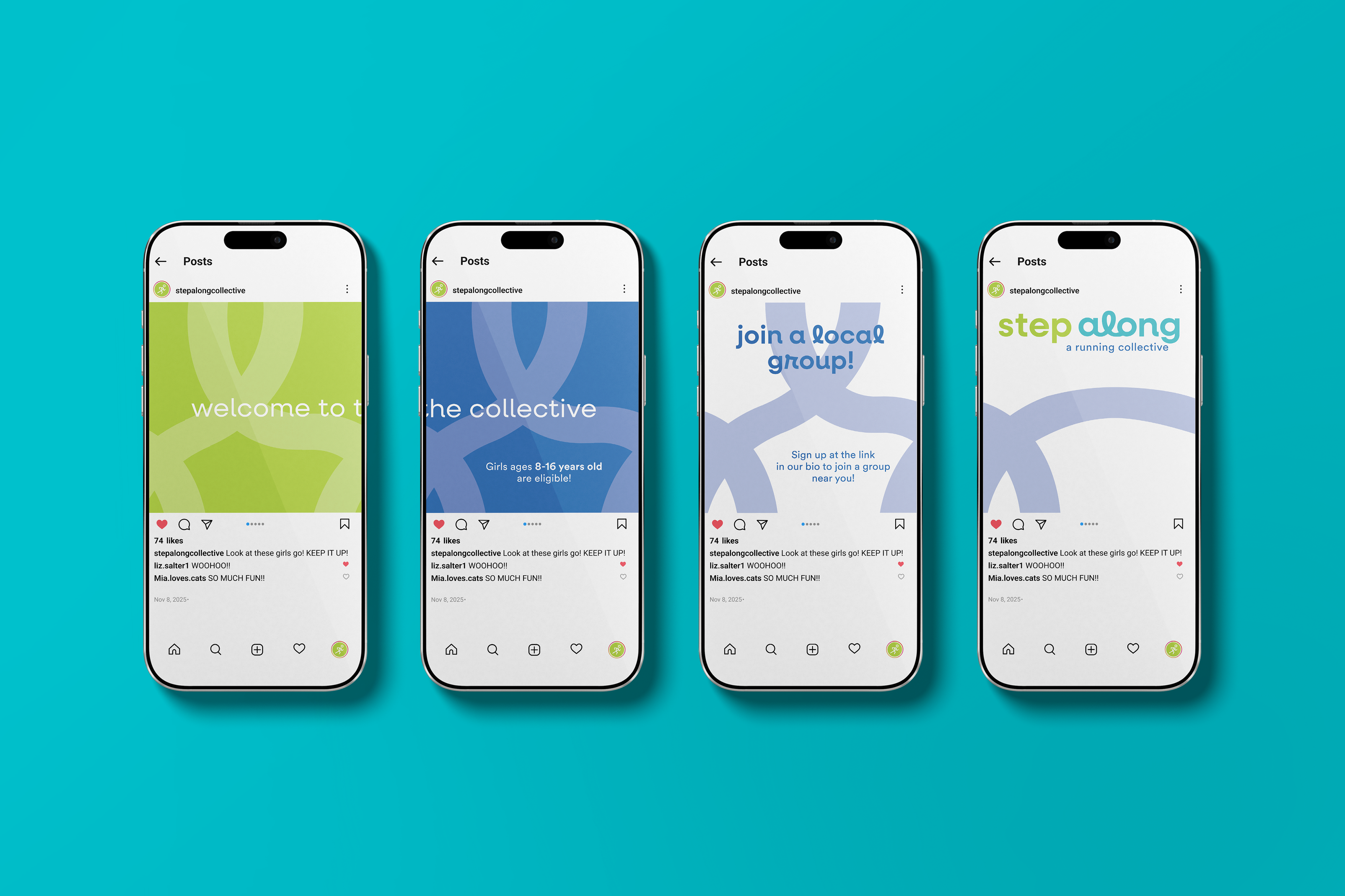 With declining mental health and physical activity levels among young girls, Step Along aims to encourage positive habits, and build supportive relationships through movement. The name of the brand itself reflects progress, and running together towards shared goals as a collective. Every element of the campaign, identity, and media plan were intentionally crafted to create an experience to empower young girls, celebrate their achievements, and strengthen communities through a common goal.