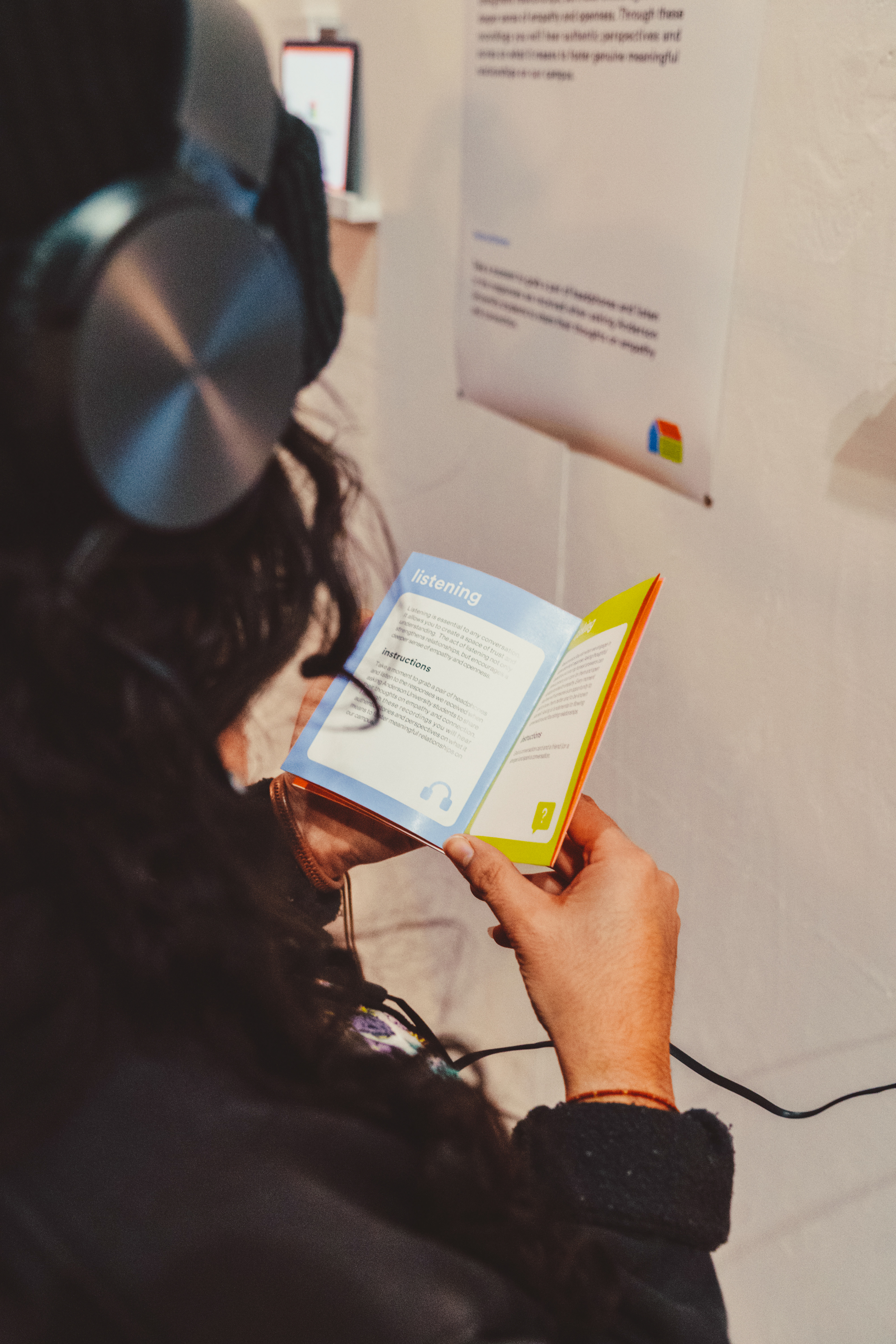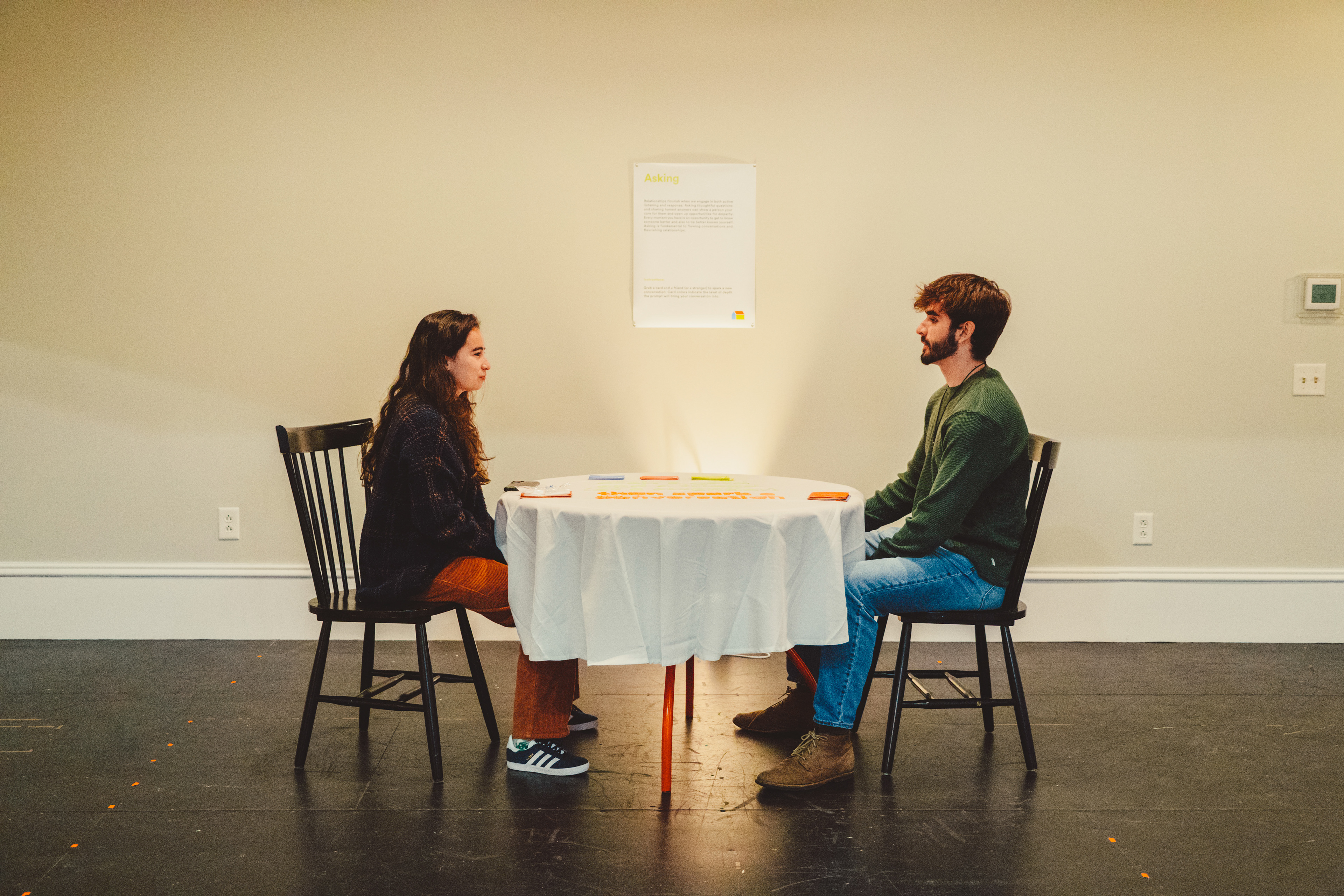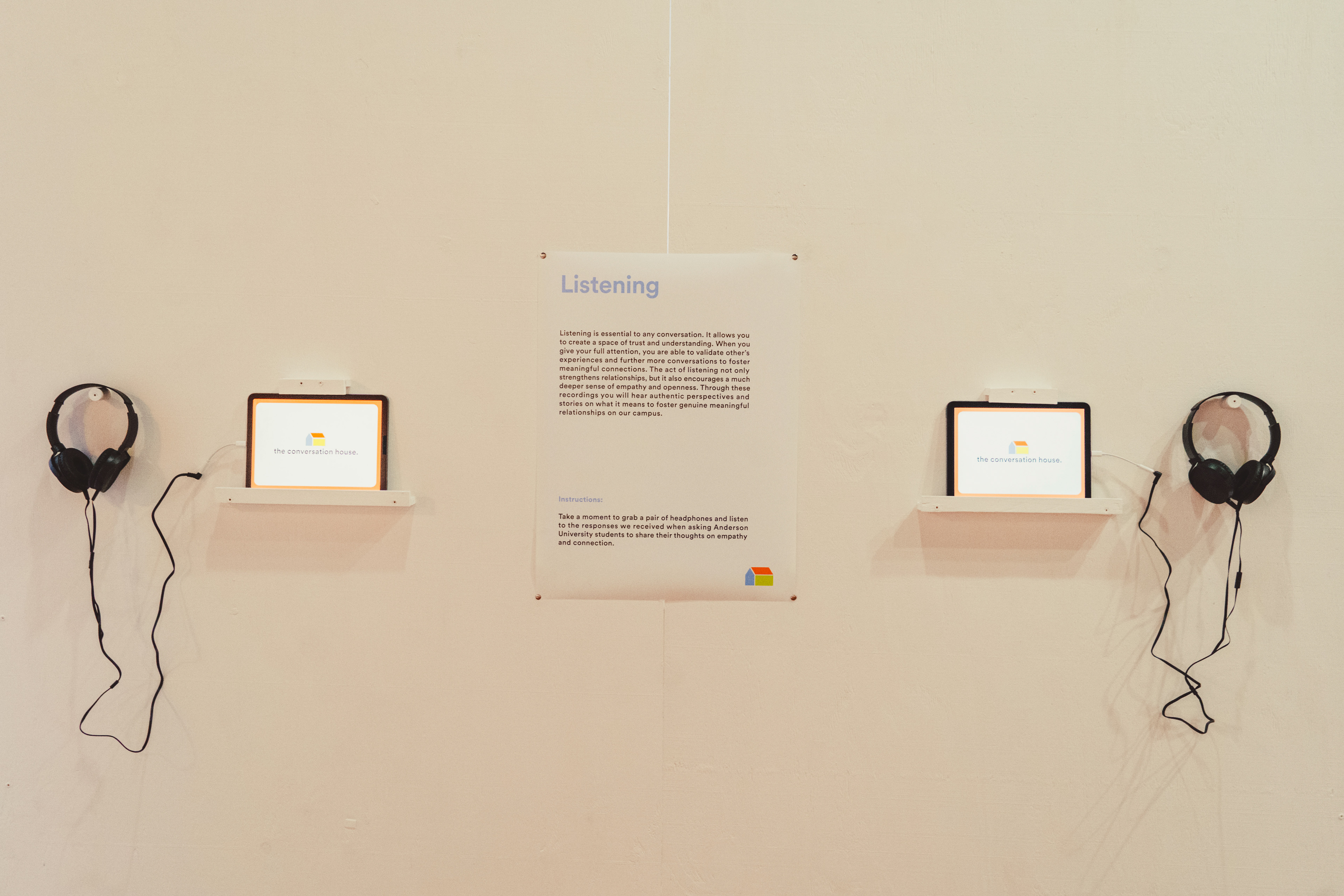 The Conversation House, held at the Chiquola Studios Gallery in downtown Anderson, SC, provided an inviting and vulnerable space for Anderson University students to engage in authentic connection. The exhibition guided attendees through the stages of a meaningful conversation, which included listening, asking, checking in, and connecting. These stations equip attendees with the tools to foster deeper connections beyond the exhibit. The non-linear layout encouraged interaction with both friends and strangers, whether it is through listening to recorded student stories, using conversation cards to spark discussions, or reflecting in the connection space. Upon arrival, attendees received gallery guide zines that unfolded into a branded poster, prompting them to introduce themselves on a collaborative sticky note wall. The experience also included a "Check-In" section, where guests could anonymously rate how they were feeling that day, as well as large posters showcasing student responses from the social campaign. The exhibit culminated in a cozy Connect space where guests could relax with a warm beverage, reflecting on their conversations and connections.