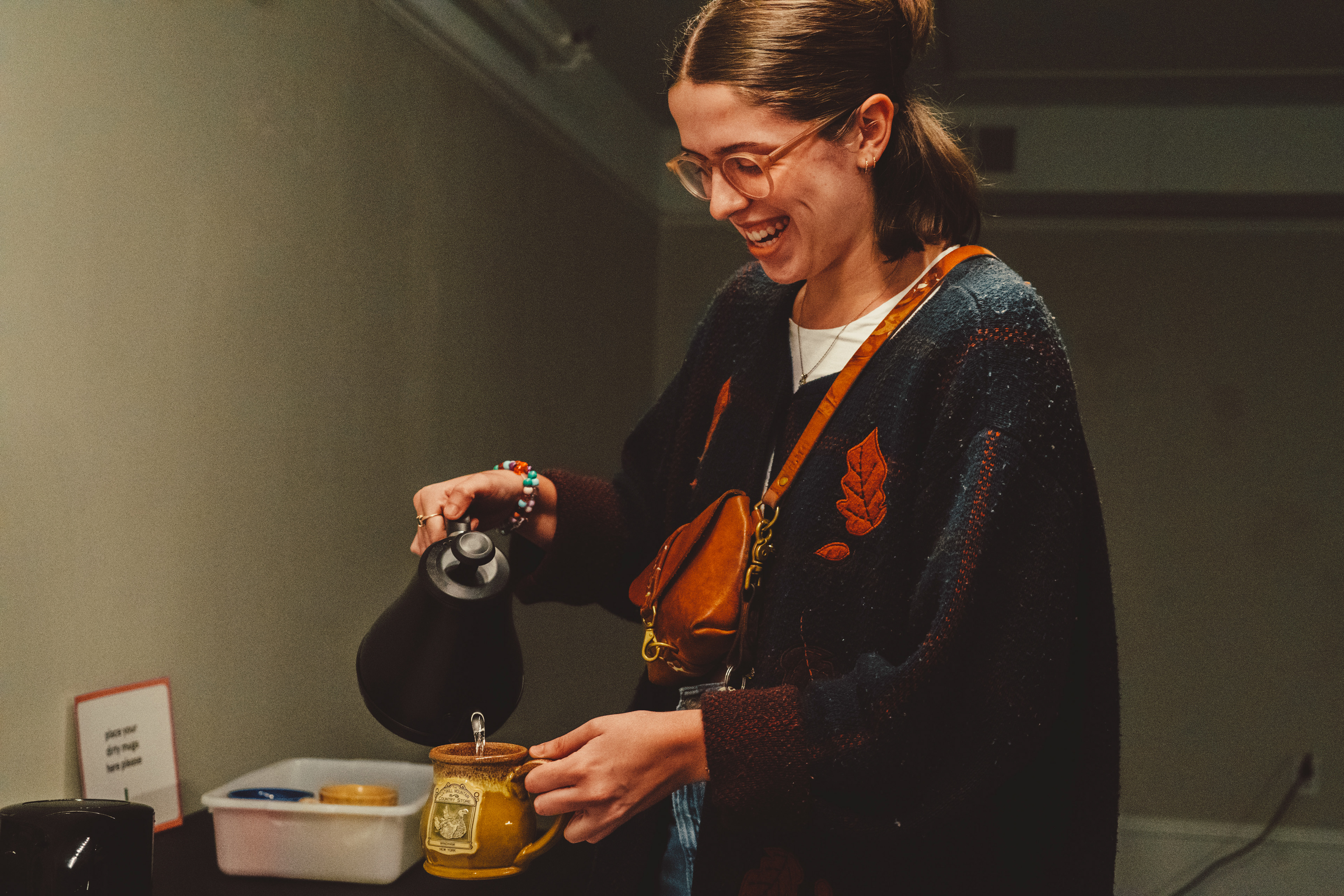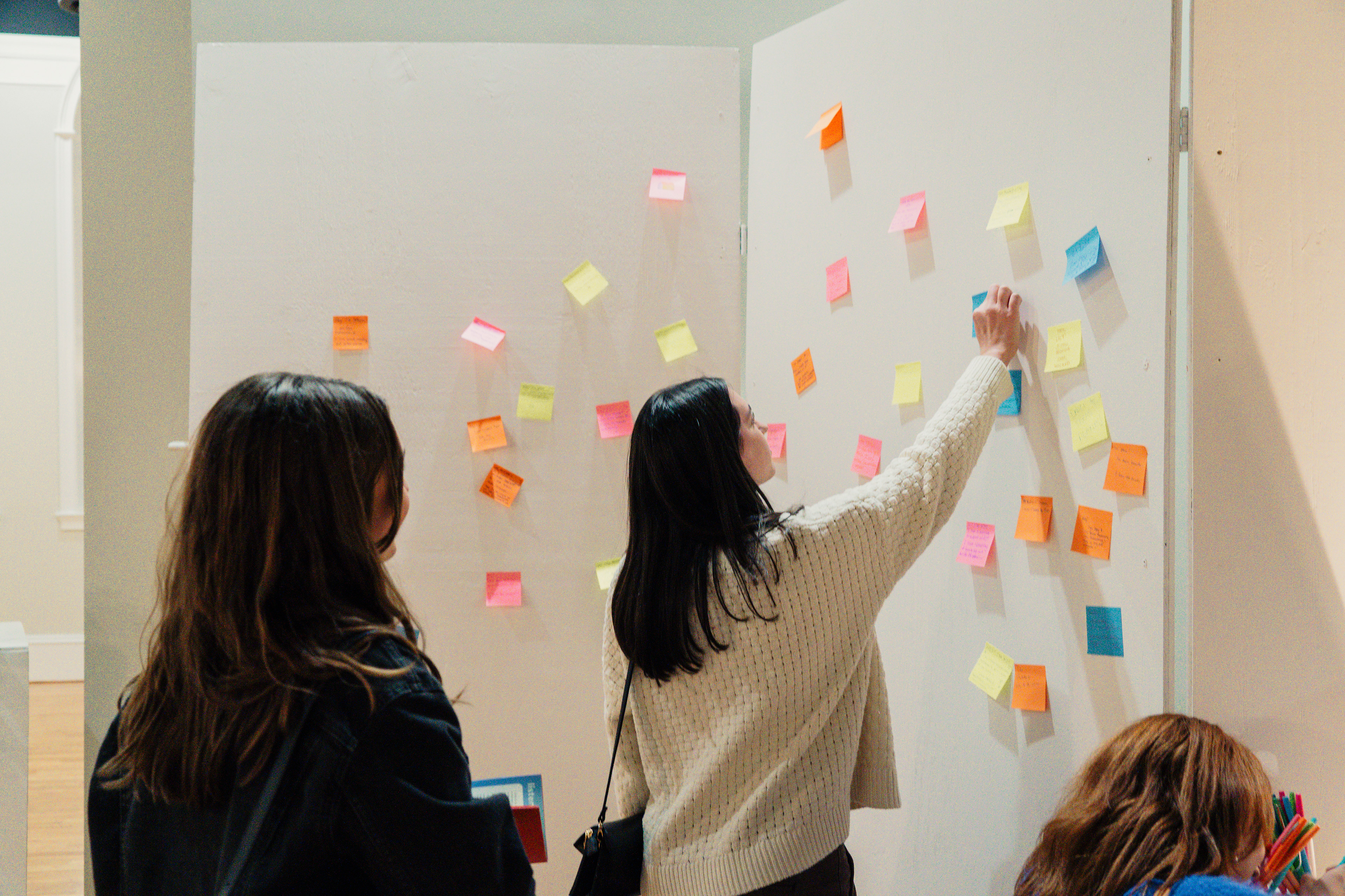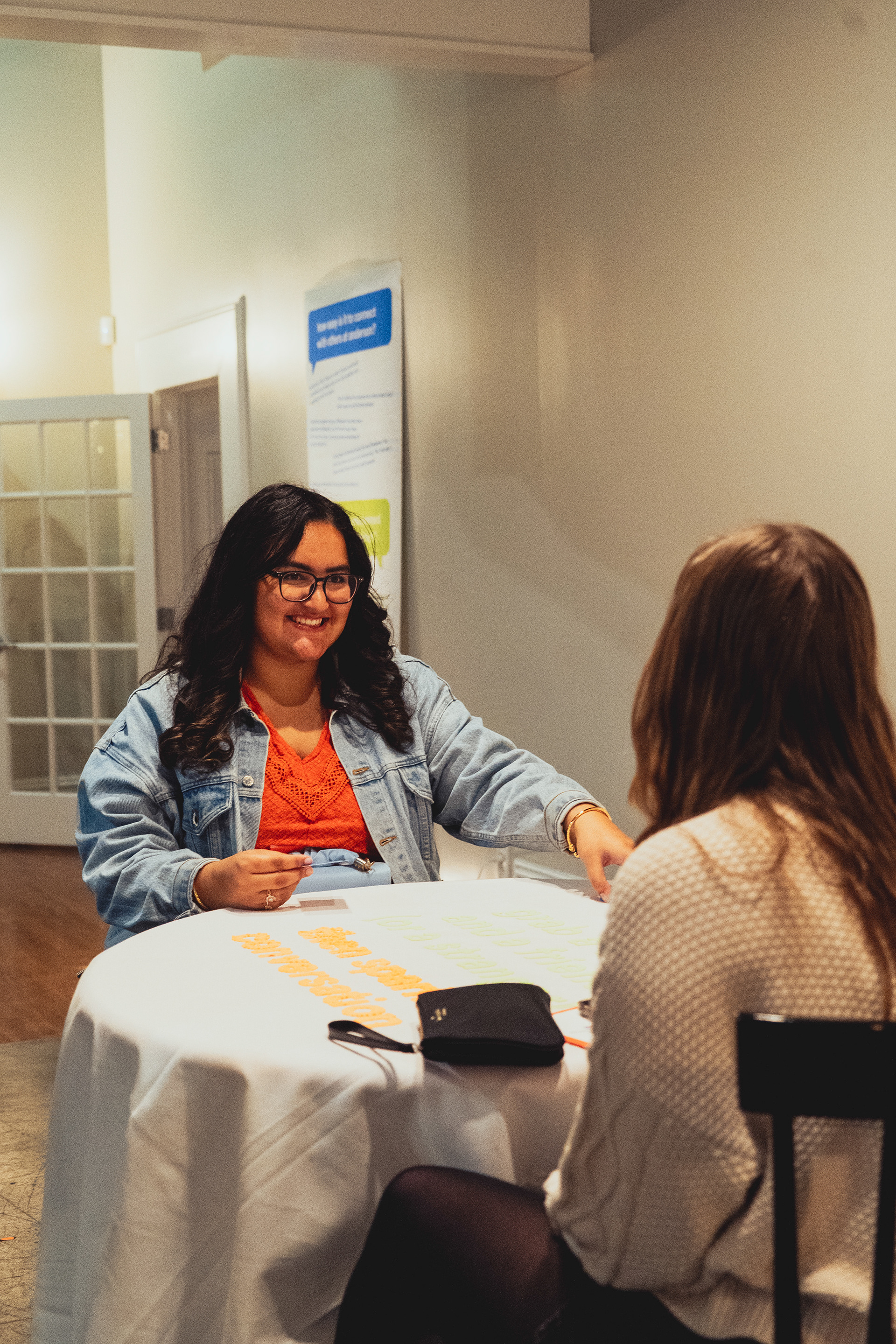 The Conversation House, held at the Chiquola Studios Gallery in downtown Anderson, SC, provided an inviting and vulnerable space for Anderson University students to engage in authentic connection. The exhibition guided attendees through the stages of a meaningful conversation, which included listening, asking, checking in, and connecting. These stations equip attendees with the tools to foster deeper connections beyond the exhibit. The non-linear layout encouraged interaction with both friends and strangers, whether it is through listening to recorded student stories, using conversation cards to spark discussions, or reflecting in the connection space. Upon arrival, attendees received gallery guide zines that unfolded into a branded poster, prompting them to introduce themselves on a collaborative sticky note wall. The experience also included a "Check-In" section, where guests could anonymously rate how they were feeling that day, as well as large posters showcasing student responses from the social campaign. The exhibit culminated in a cozy Connect space where guests could relax with a warm beverage, reflecting on their conversations and connections.