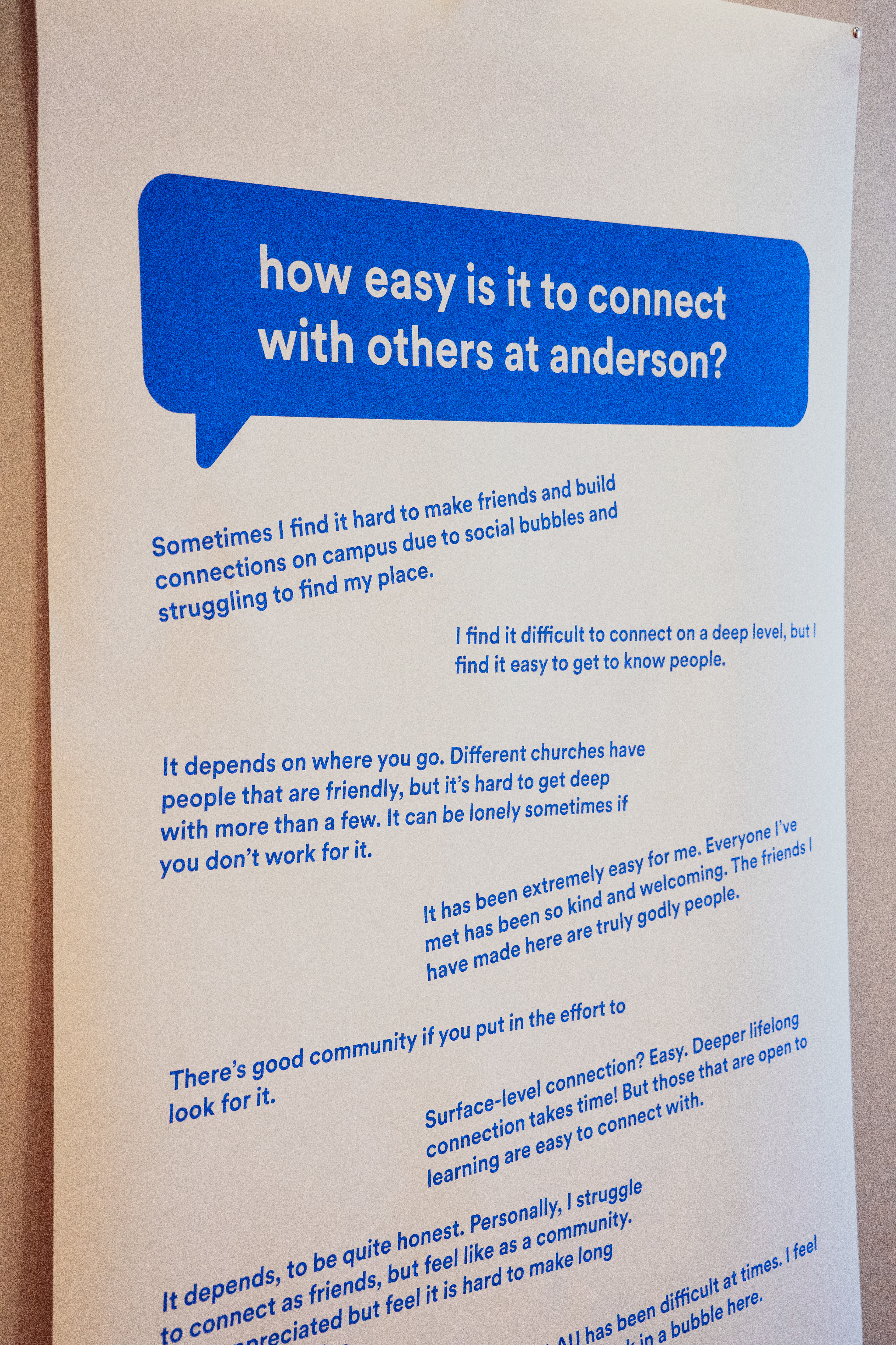 The social campaign and the exhibition were very well responded to. The social campaign sparked conversations that may not have happened and got students interested to see what it was leading up to at the exhibition. By using the response cards, we were able to gain a better understanding of how students on campus felt about the topics that were being discussed. During the exhibition, viewers we able to connect with friends on a deeper level, as well as get to know new people It was a time well spent investing in community with others and was very well received as a whole.